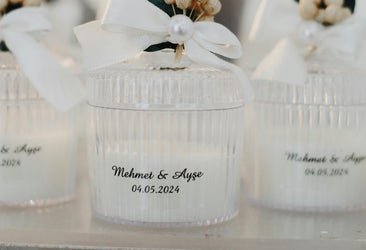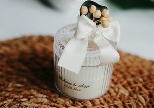 Laissez la magie opérer avec des bougies conçues exclusivement pour votre mariage. Chaque pièce est le reflet de votre histoire d'amour, un détail raffiné pour embellir votre célébration.